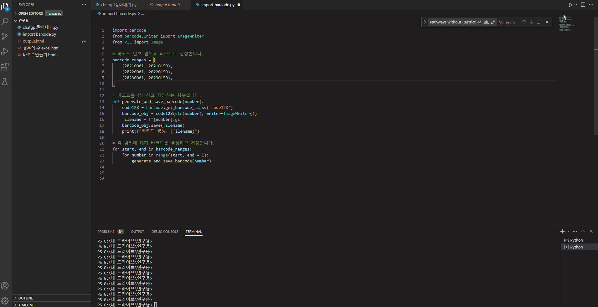 이제 코드를 실행하면 지정된 범위의 바코드 번호에 대해 Code-128 바코드 이미지를 생성하고, 각 이미지를 번호와 동일한 이름의 gif 파일로 저장합니다. 바코드 생성이 완료되면 터미널에서 "바코드 생성: [파일명].gif"와 같은 메시지가 출력됩니다.