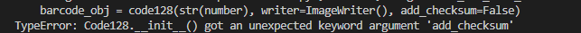 죄송합니다. python-barcode 라이브러리의 Code128 클래스에서 'add_checksum'이라는 인자는 사용할 수 없습니다. 이를 제거하면 됩니다. 아래 수정된 코드를 참고하세요.