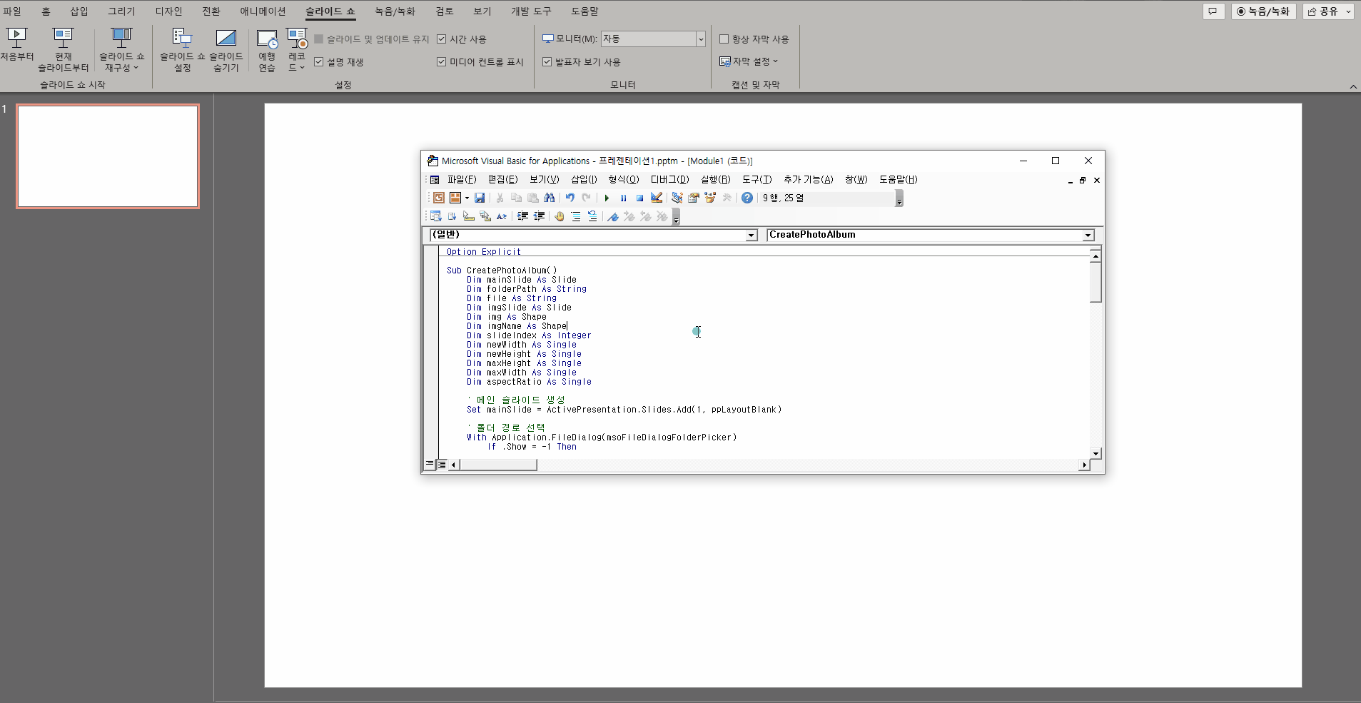 위 코드를 기존 CreatePhotoAlbum 매크로의 다음 줄에 추가하십시오: