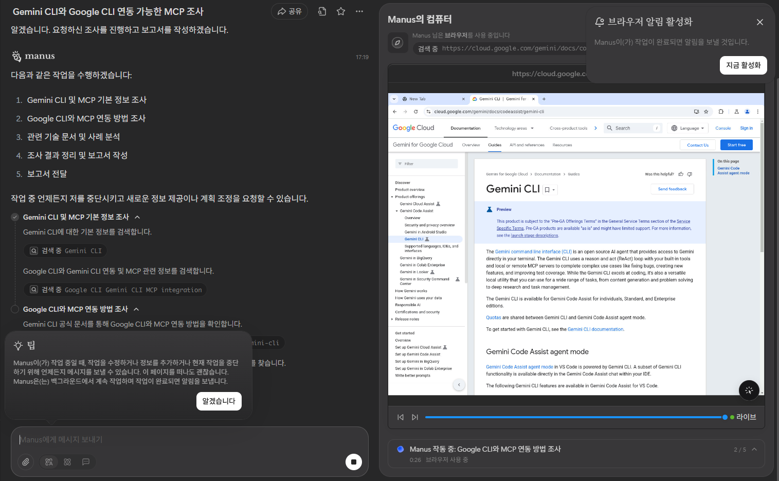 최근에 gemini cli라는 것이 만들어졌는데, google cli와 연동할 수 있는 mcp를 검색을 통해 조사하고, 보고서를 작성해줘.요청을 입력하자, Manus는 스스로 작업 계획을 세우고 웹 브라우저를 열어 관련 정보를 검색하기 시작했습니다.