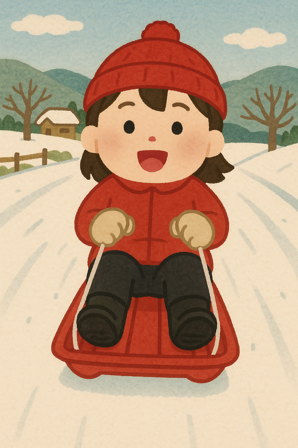 irasutoya그림체로, 눈썰매를 타는 여자아이를 그려줘
