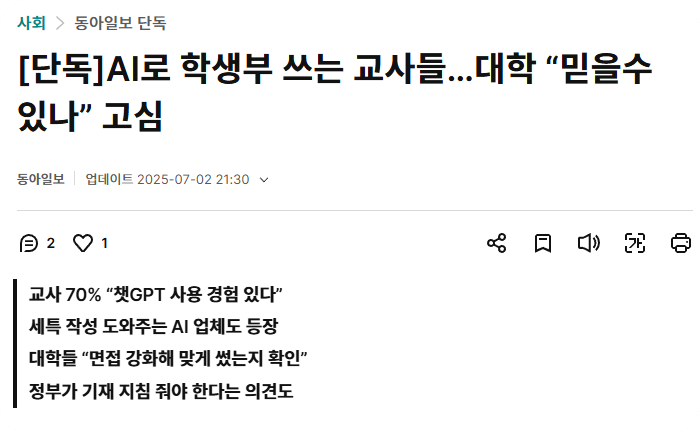 다시말해 AI사용을 문제 삼는 것 자체가 학생, 학부모, 교사, 대학의 역학관계를 이해하지 못했다는 뜻입니다. 대학은 학교의 생활기록부에 간섭할 수 없고, 교사는 학생을 많이 받기 위해, 생활기록부의 내실화를 통해 좋은 입시결과를 내어야합니다.