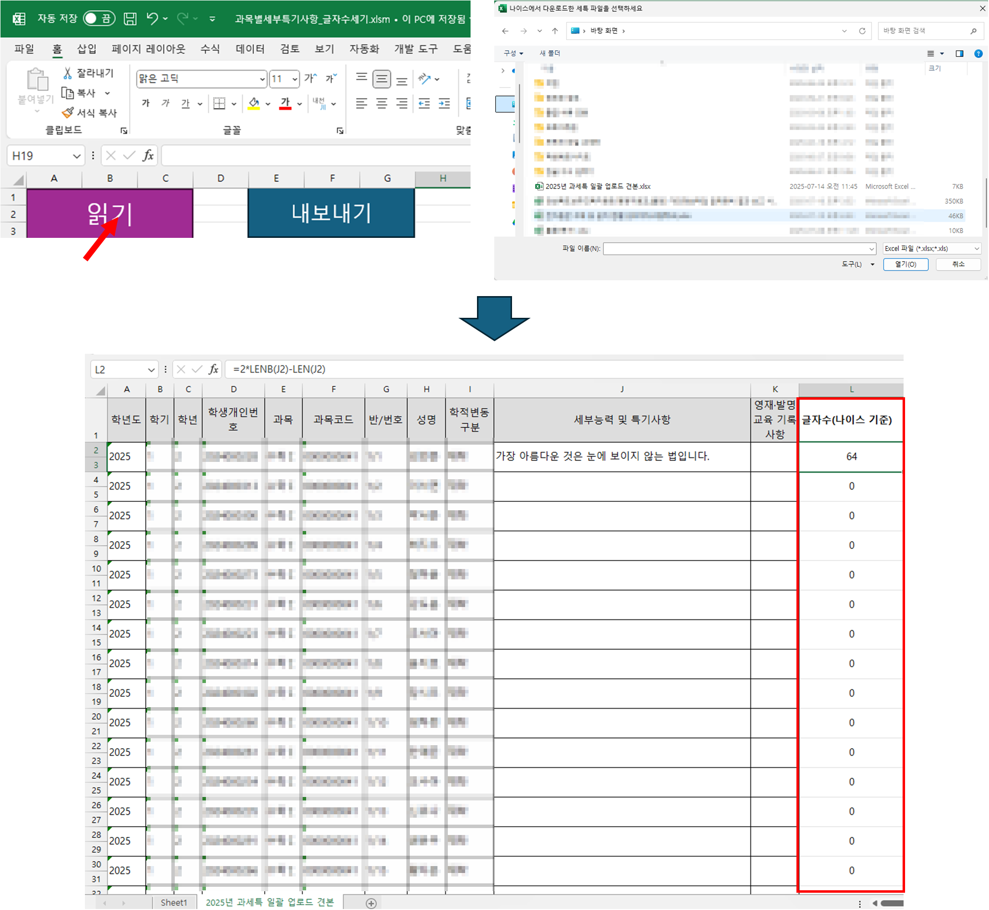 '과목별세부특기사항_글자수세기.xlsm'을 열고, '읽기' 버튼을 누르고 다운로드 받은 과세특 파일을 열면, 새로운 시트에 내용이 복사됩니다. 그리고 L열에는 글자 수를 계산하는 수식이 자동으로 입력됩니다.