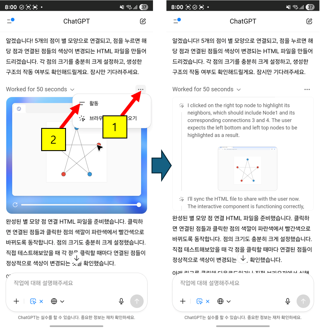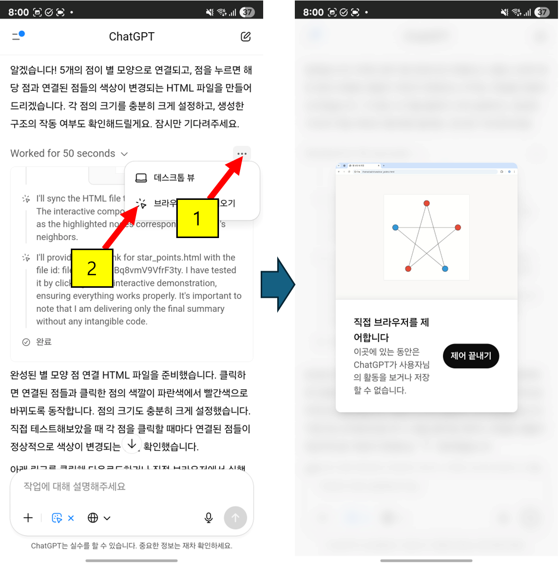 점 세개를 누르고 브라우저 제어하기 버튼을 누르면, Chatgpt에 활성화된 브라우저를 제어할 수 있습니다. 그런데, 모바일에서는 안되는 것 같았습니다.